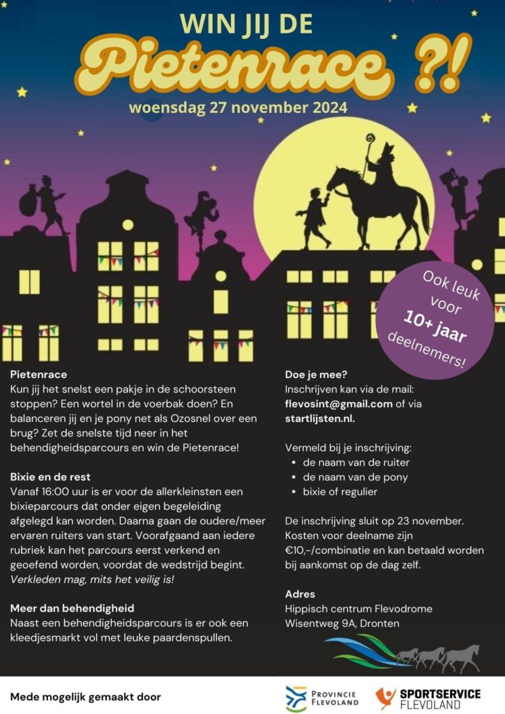 Omdat het een groot succes was vorig jaar, organiseren wij dit jaar weer met medewerking van de Sint en zijn pieten op woensdagmiddag 27 november de gezellige pietenrace.