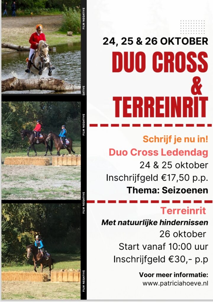 Over ruim 3 weken is het weer zover!!! Onze gezellige duo cross die we samen met de Patriciahoeve organiseren in het Spijkbos, Biddinghuizen gaat plaats vinden vrijdag 24 en zaterdag 25 Oktober. Geef je nu op en bedenk in wat voor mooie outfit je dit jaar op zaterdag de cross gaat rijden. Voor verdere informatie zie de flyer hieronder.
