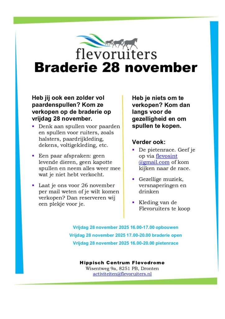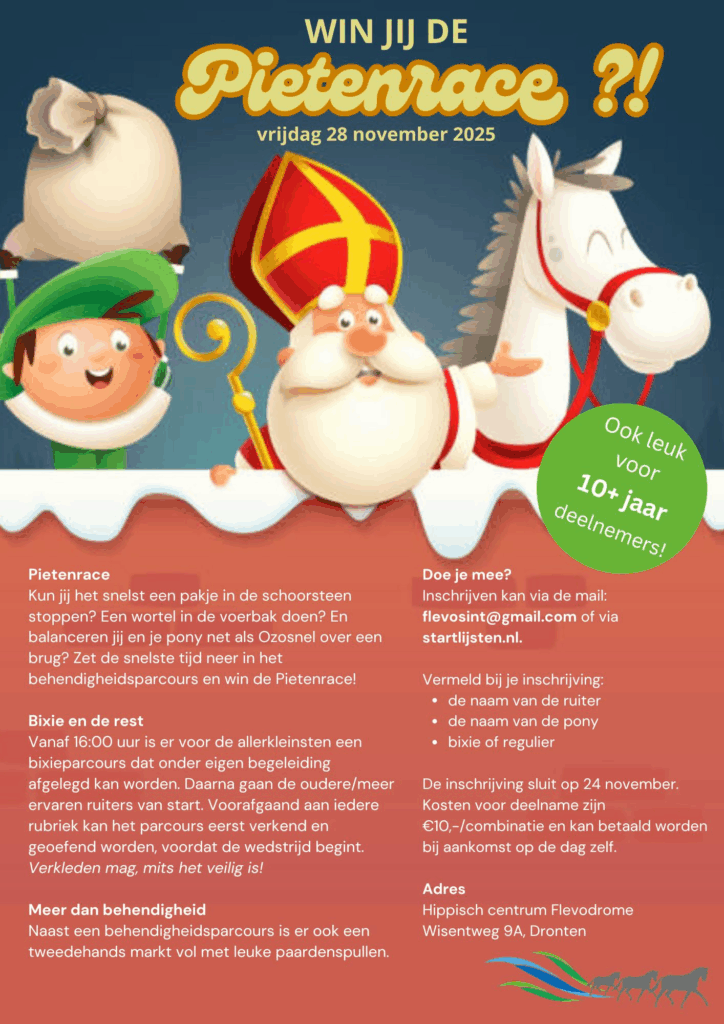 Sinterklaas heeft toegezegd en komt ook dit jaar weer bij ons op het Hippisch Centrum Flevodrome om alle kinderen met hun pony’s te bewonderen en aan te moedigen bij onze jaarlijkse pietenrace. Geef je snel op zodat jouw plek gereserveerd is en je je behendigheid kan laten zien in het mooie aangeklede parcours. Tevens wordt er weer een kleine braderie gehouden, dus als je nog mooie goede paardenspullen hebt kom en reserveer dan via activiteiten@flevoruiters.nl je plekje.